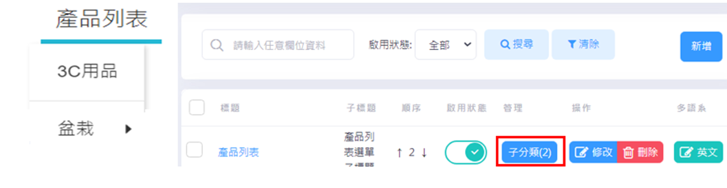 可至後台 選單管理>選單分類>子分類按鈕(右側頁面)>新增按鈕,新增流程與新增導覽列相同