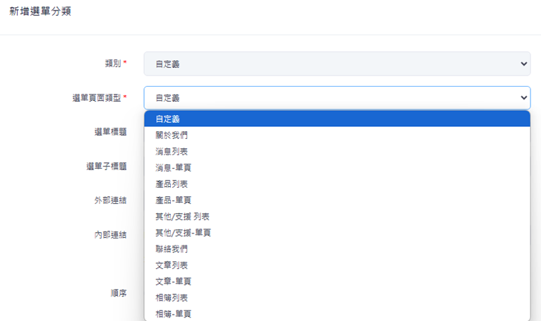 選單頁面類型:列表類、自定義有子分類按鈕,單頁類-無子分類按鈕